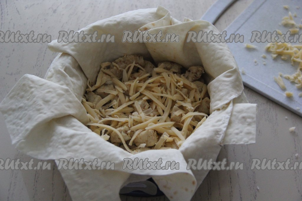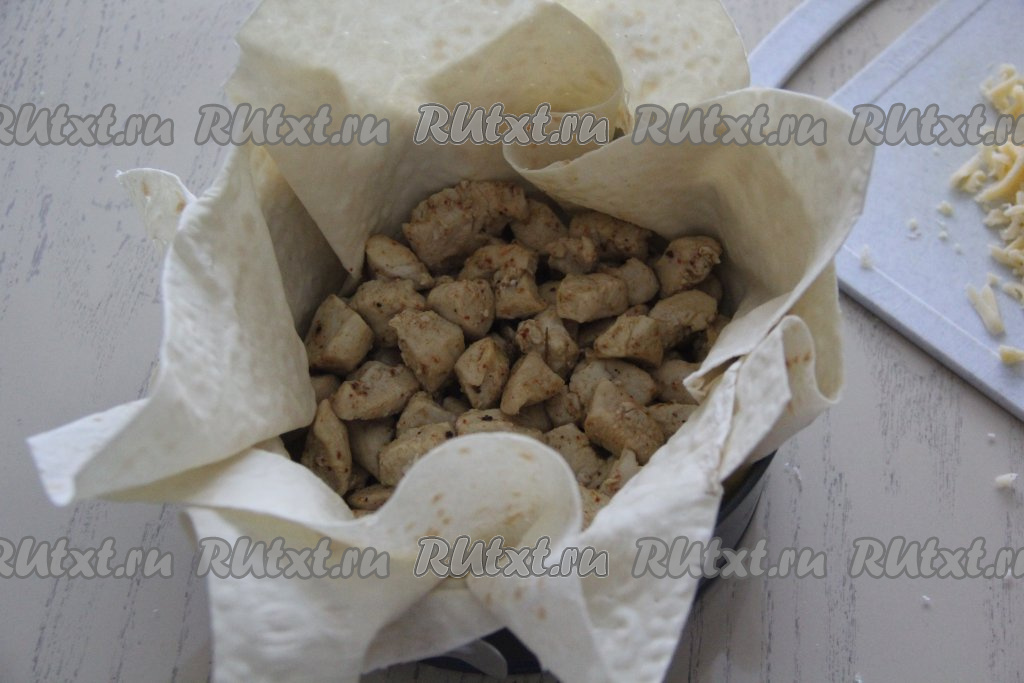 Выложить на дно формы с лавашом обжаренную остывшую курицу.