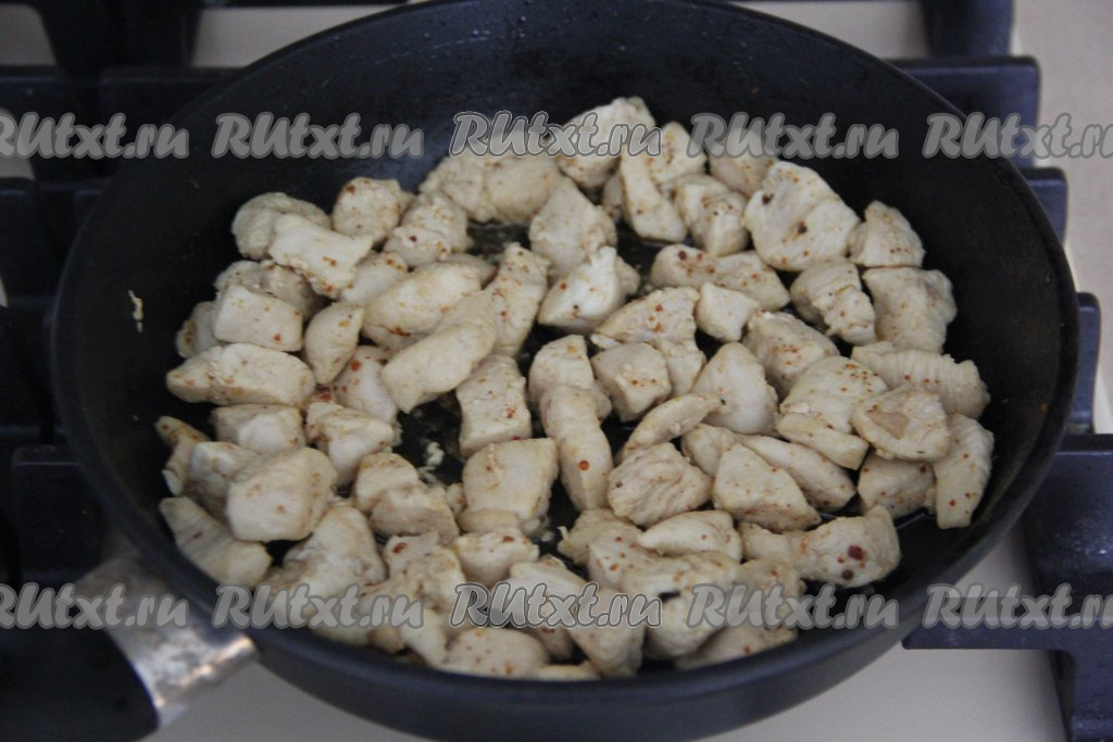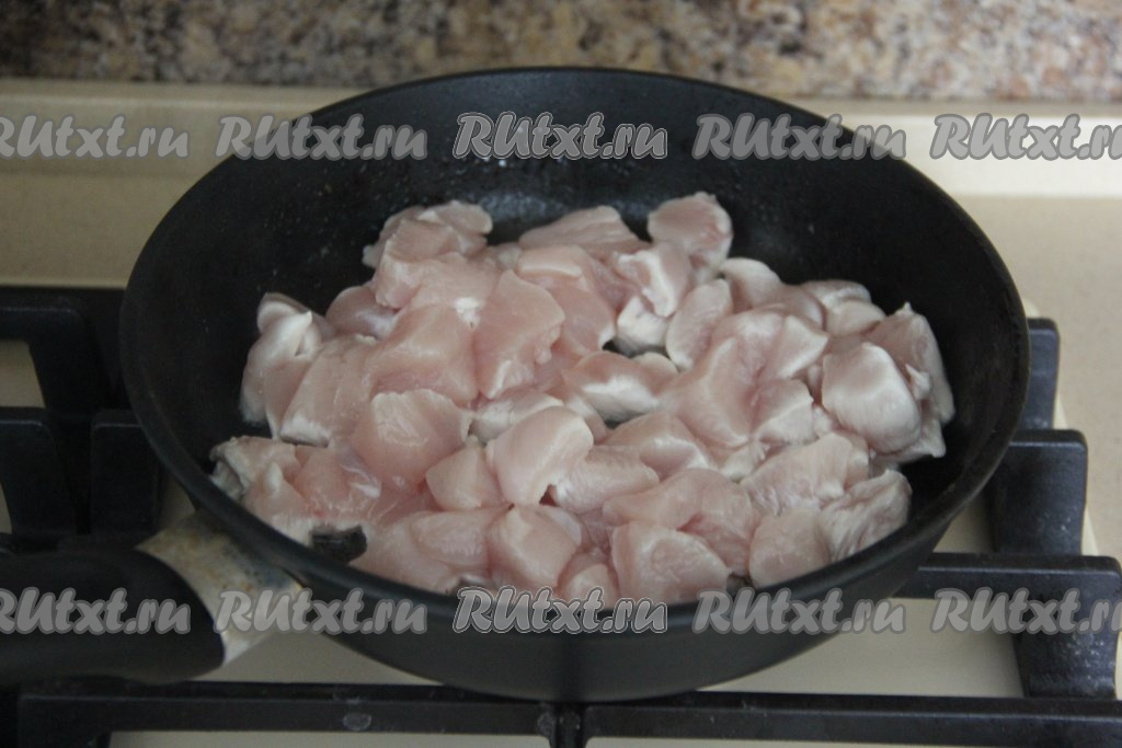 Нарезать куриное филе на кубики размером, примерно, 1,5 см на 1,5 см.