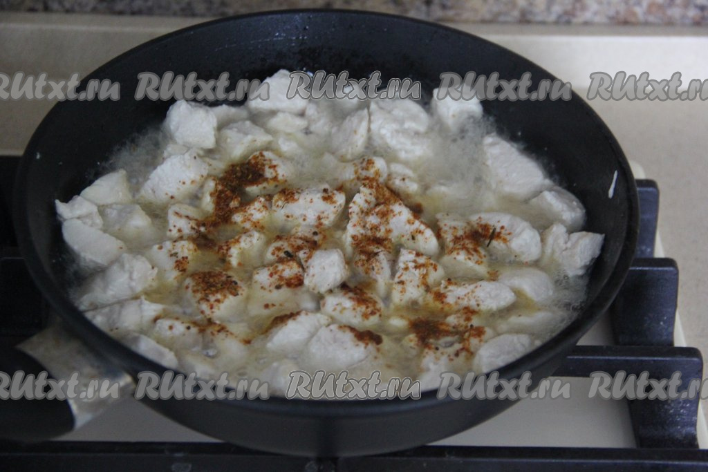 Добавить соль и специи, обжарить кусочки куриного мяса, иногда перемешивая, в течение 10 минут на среднем огне.