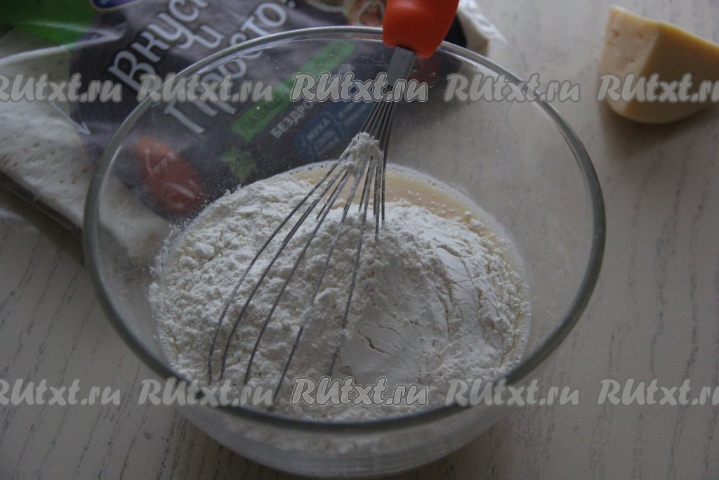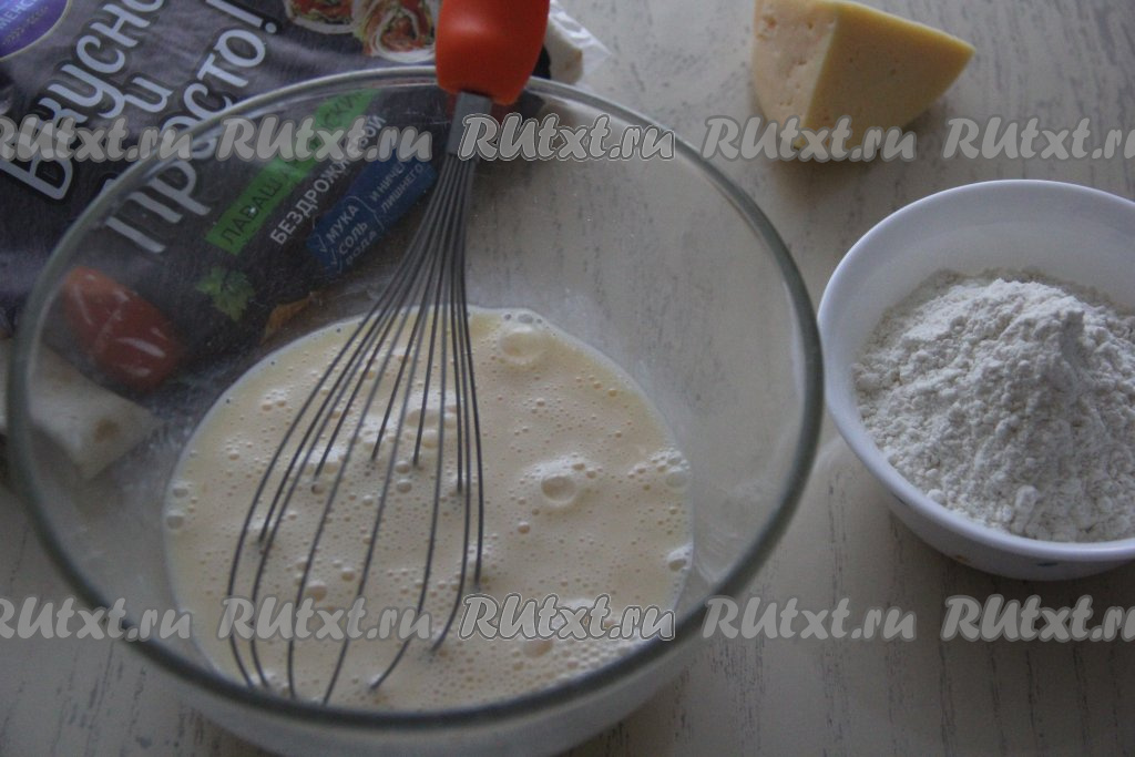 Для приготовления заливки нужно в миске соединить молоко и яйца, добавить соль по вкусу, перемешать венчиком.
