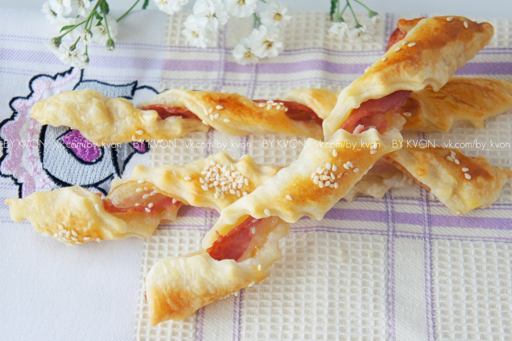 Порой совсем не хочется долго "возиться" на кухне, готовя торты или другую, довольно сложную и трудоёмкую выпечку. А ведь так хочется "услышать" аромат свежей выпечки в доме и насладиться приятным чаепитием с домашними вкусностями в дождливый денёк. Именно для таких случаев есть несколько рецептов быстрой в приготовлении и вкусной выпечки, например, из слоёного теста. Тесто вы можете приготовить заранее и заморозить, если вы не собираетесь сразу же готовить из него. Или же воспользуйтесь покупным слоёным тестом, что значительно сэкономит ваше время. Мы с вами готовили вместе слоёные палочки с кунжутом. Сегодня приготовим - слоёные палочки с беконом. Оба варианта просты в приготовлении, а результат вас должен приятно порадовать.