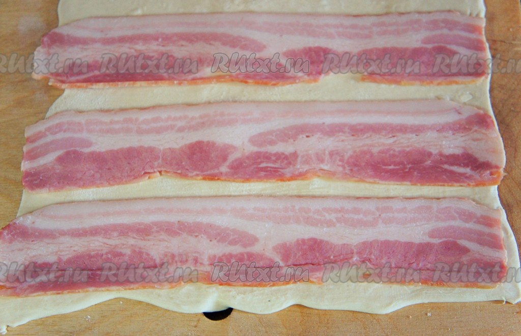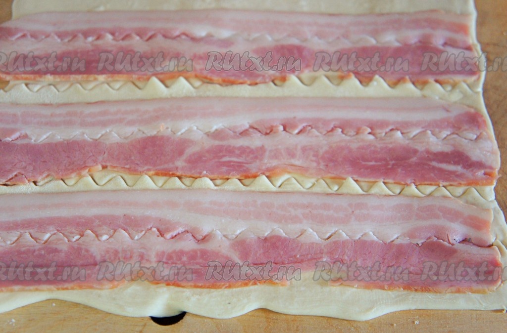 Разрезать тесто с беконом на полоски.