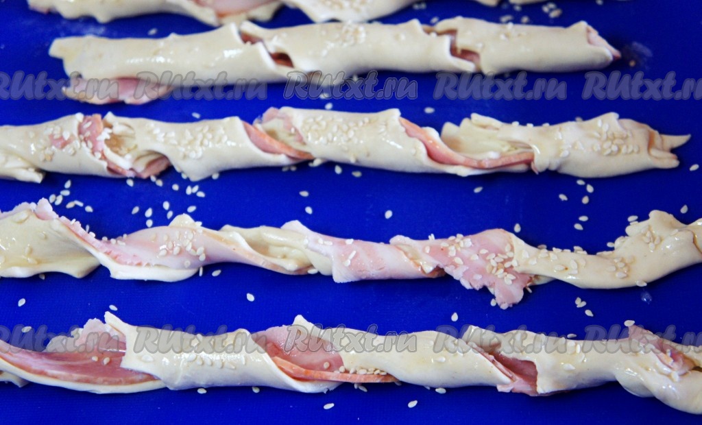 Духовку разогреть до 200 градусов. "Закрутить" слоёные палочки произвольным образом, выложить на силиконовый коврик, смазать взбитым яйцом и присыпать кунжутом. Выпекать в течение 20-30 минут до образования аппетитной золотистой корочки.