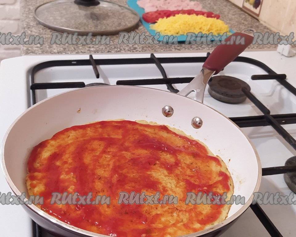 Перевернуть ещё раз, убавить огонь до самого минимума, смазать картофельную основу пиццы кетчупом (или томатным соусом).