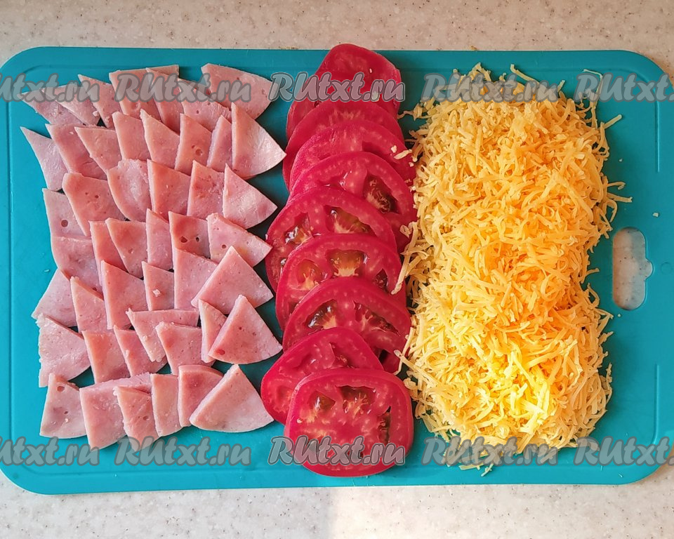 Пока выпекается основа, подготовить начинку для пиццы. Помидор нарезать кружочками, ветчину (или варёную колбасу) - сегментами, сыр натереть на мелкой тёрке.
