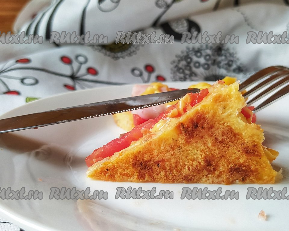 Выложить начинку с следующем порядке: немного сыра, помидоры (посолить, приправить специями), ветчина и оставшийся сыр. Накрыть крышкой и дождаться, пока сыр полностью расплавится.