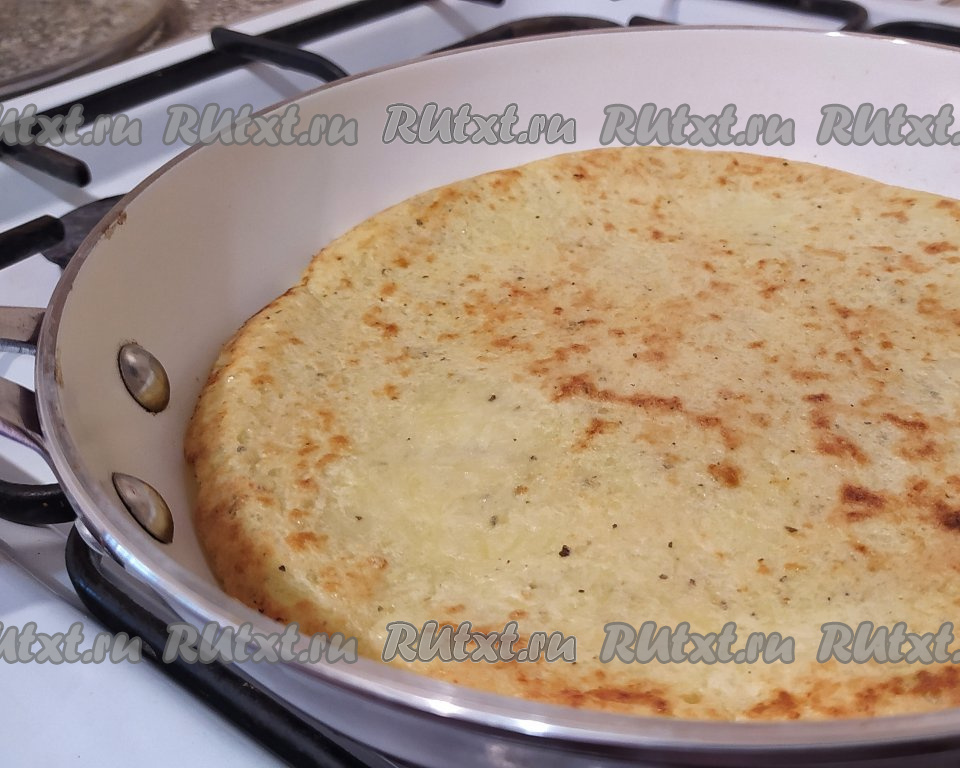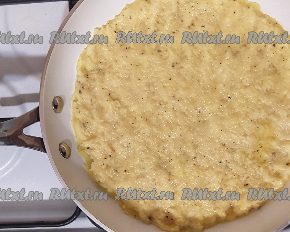 На смазанной растительным маслом разогретой сковороде лопаткой или руками равномерно распределить картофельное тесто. На сковороде с диаметром дна 20 см получится основа для картофельной пиццы толщиной 0,5 см. Выпекать картофельную основу под закрытой крышкой на среднем огне 8 минут.