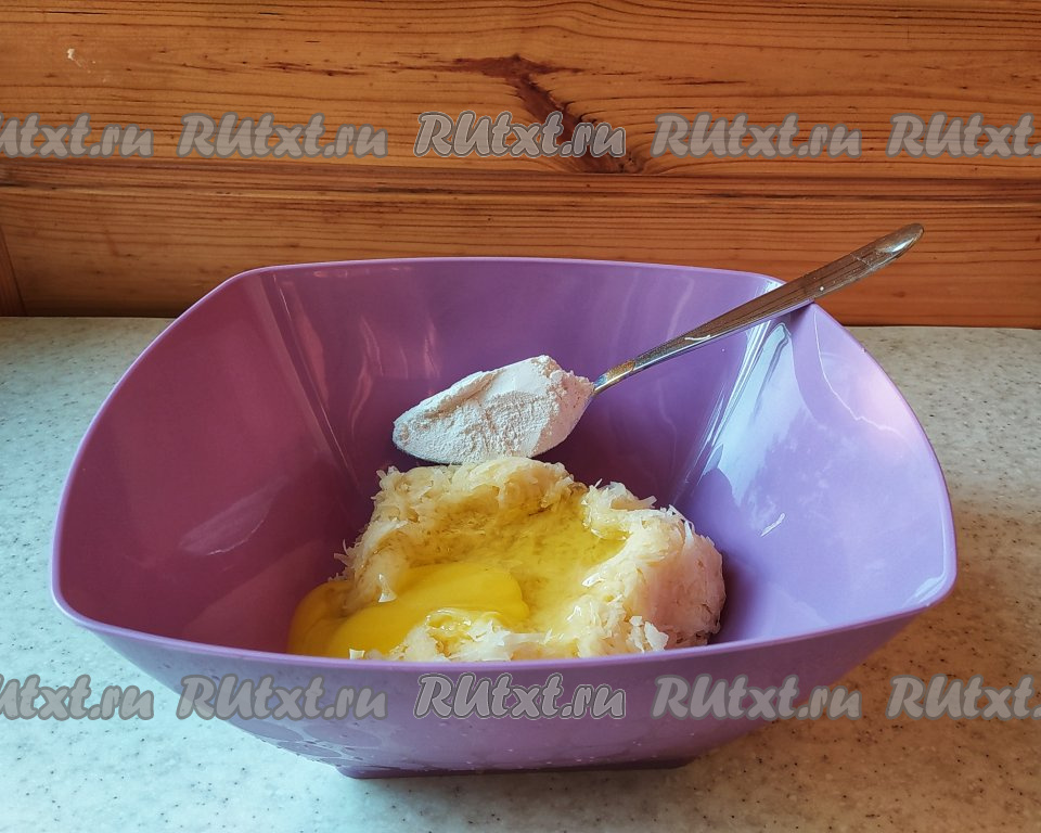 После того как будет отжата жидкость, добавить к картофельной массе сырое яйцо, муку, соль и специи.