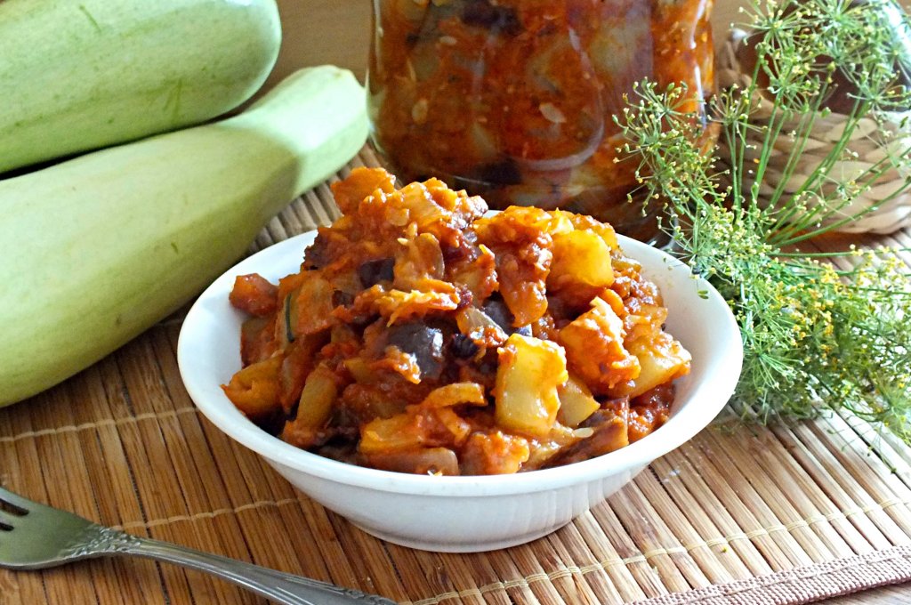 Из кабачков и баклажанов можно приготовить на зиму вкусный, достаточно сытный, аппетитный салат. Овощи тушатся практически в собственном соку, без добавления большого количества растительного масла. Кусочки кабачков и баклажанов в процессе тушения не развариваются полностью, сохраняя форму. Томатная паста, входящая в состав заготовки, подчёркивает овощной вкус. Этот простой, ароматный салат можно подать и в качестве закуски, и в качестве отличного гарнира к мясу, рыбке.