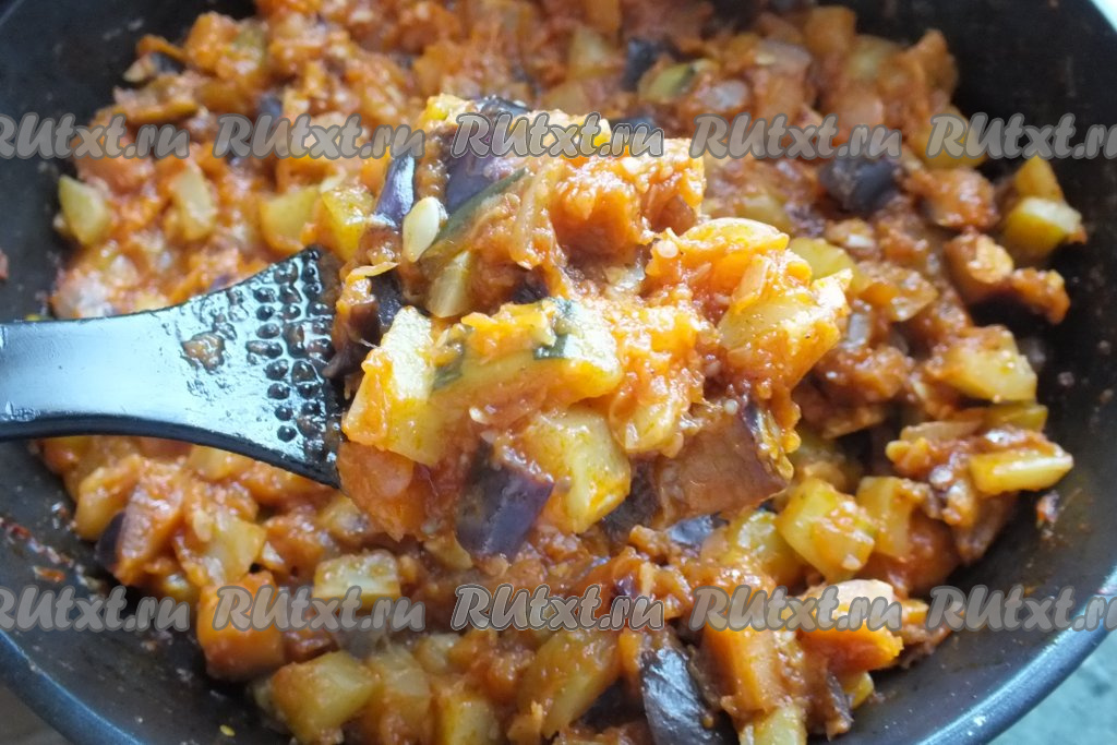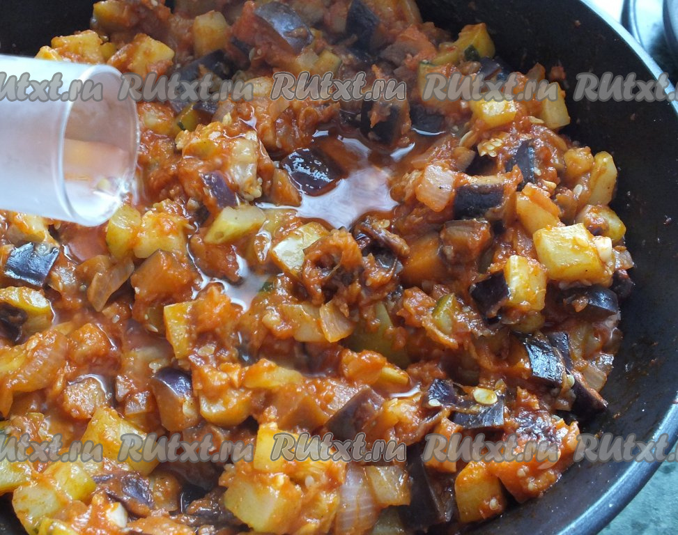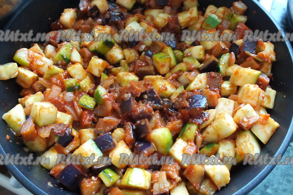В конце тушения попробуйте салат из баклажанов и кабачков на вкус (возможно, потребуется добавить немного соли и сахара). Жидкости к этому моменту в салате уже не должно быть.