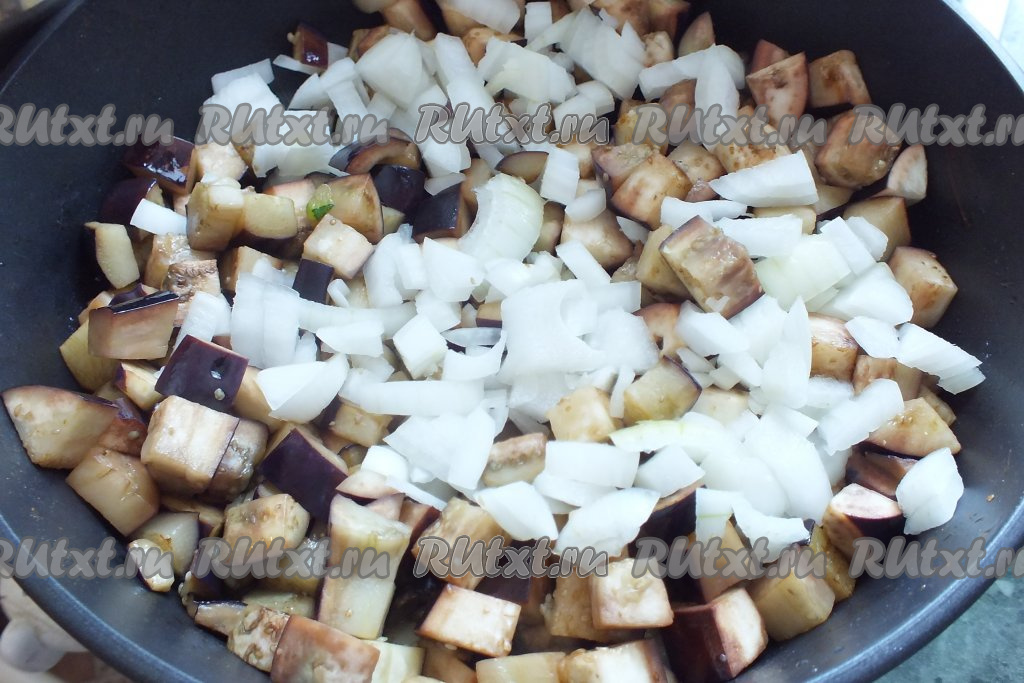 В жаровне (или в сковороде с толстым дном) разогрейте растительное масло, выложите баклажаны и, помешивая, обжарьте, не забывая периодически перемешивать, на умеренном огне в течение 5-7 минут (за это время баклажаны немного "осядут"), затем добавьте нарезанный лук. Обжаривайте, помешивая, в течение 7-10 минут.