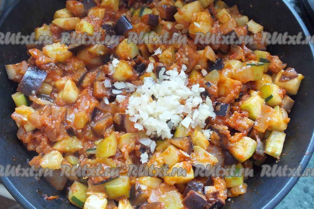 Затем добавьте измельчённый чеснок, перемешайте, прикройте крышкой, тушите овощной салат 7 минут.