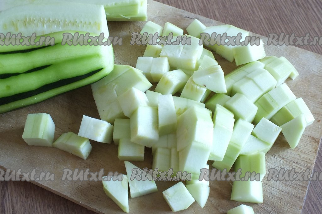 Подготовьте кабачки. Снимите кожицу, нарежьте на кубики со стороной 1,5-2 см.