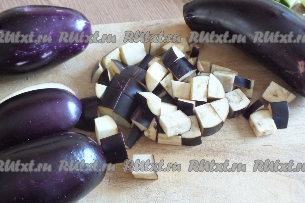 Баклажаны, не очищая от кожуры, нарежьте на кубики такого же размера, как нарезаны и кабачки (со стороной, примерно, 1,5-2 см).