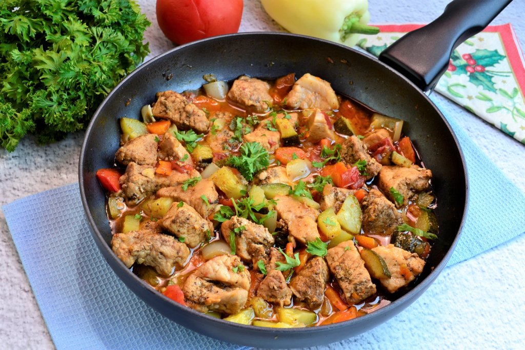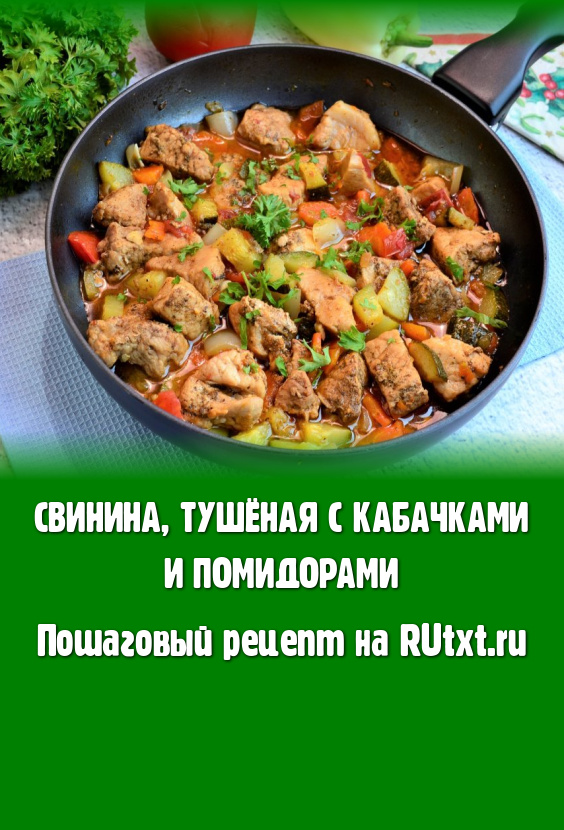 Предлагаю вам попробовать свинину, тушёную на сковороде с кабачками и помидорами. Кусочки мяса получаются мягкими, а овощи прекрасно дополняют его. Это простое, очень вкусное и ароматное блюдо можно подать с гарниром из картофельного пюре, макаронами, различными кашами (гречкой, перловкой, рисом, кус-кусом, булгуром и т.д.).