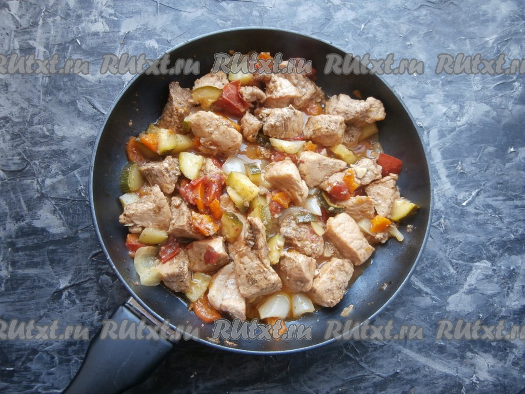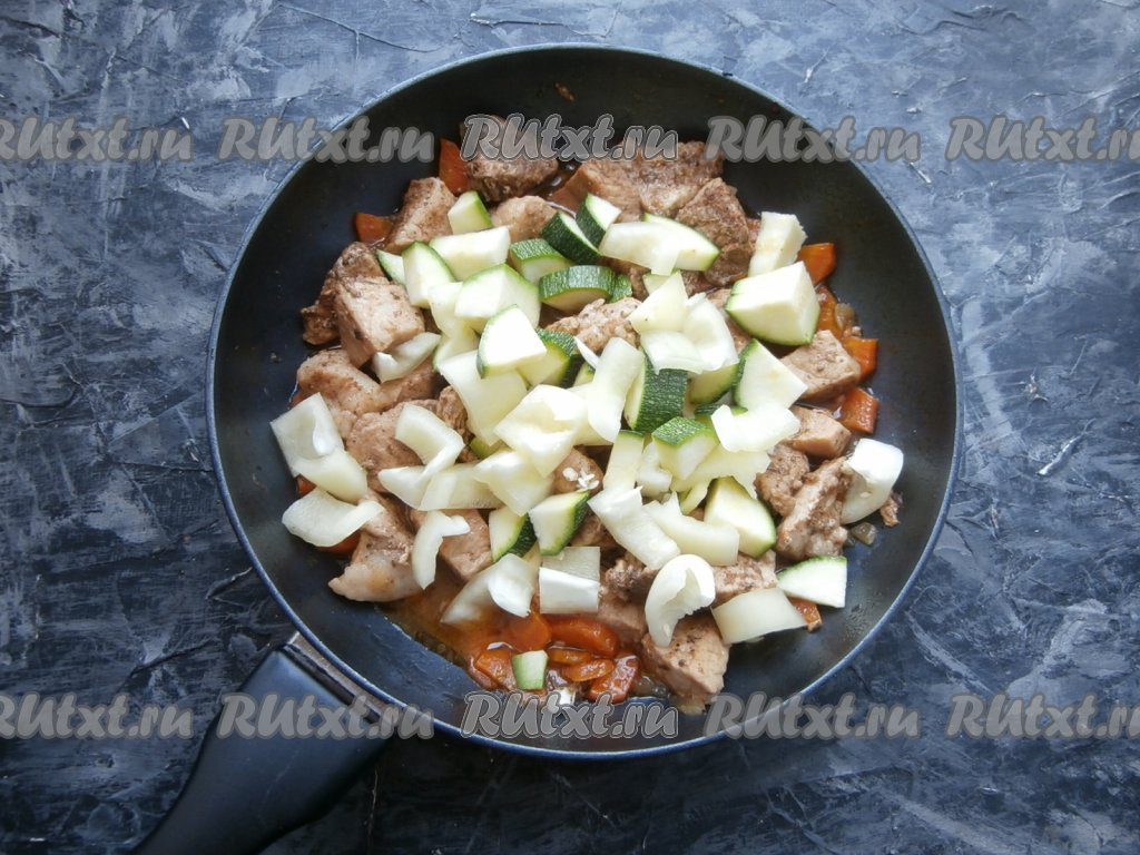 Накрыть сковороду крышкой, довести до кипения и тушить свинину на самом минимальном огне в течение 30-35 минут. Далее добавить в сковороду нарезанные кусочками кабачки и болгарский перец.