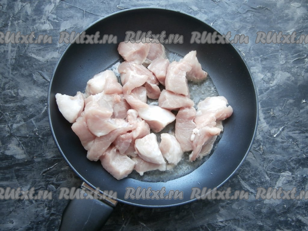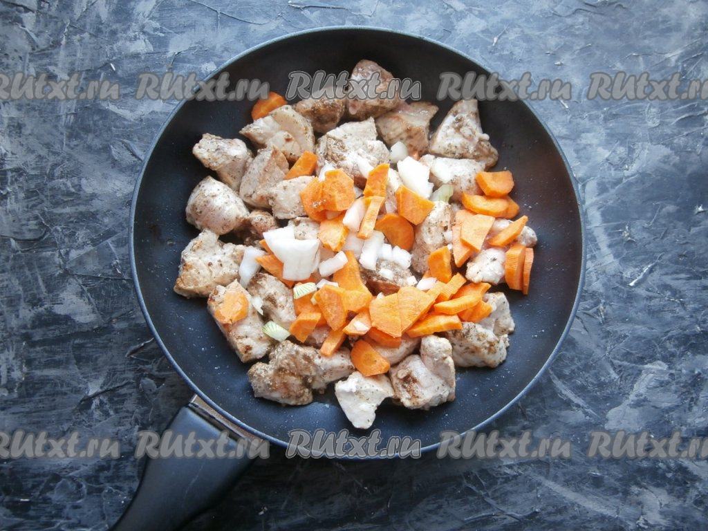 Обжарить кусочки свинины со всех сторон до лёгкой румяности на среднем огне, затем добавить нарезанный произвольно репчатый лук и нарезанную полукружочками морковку.