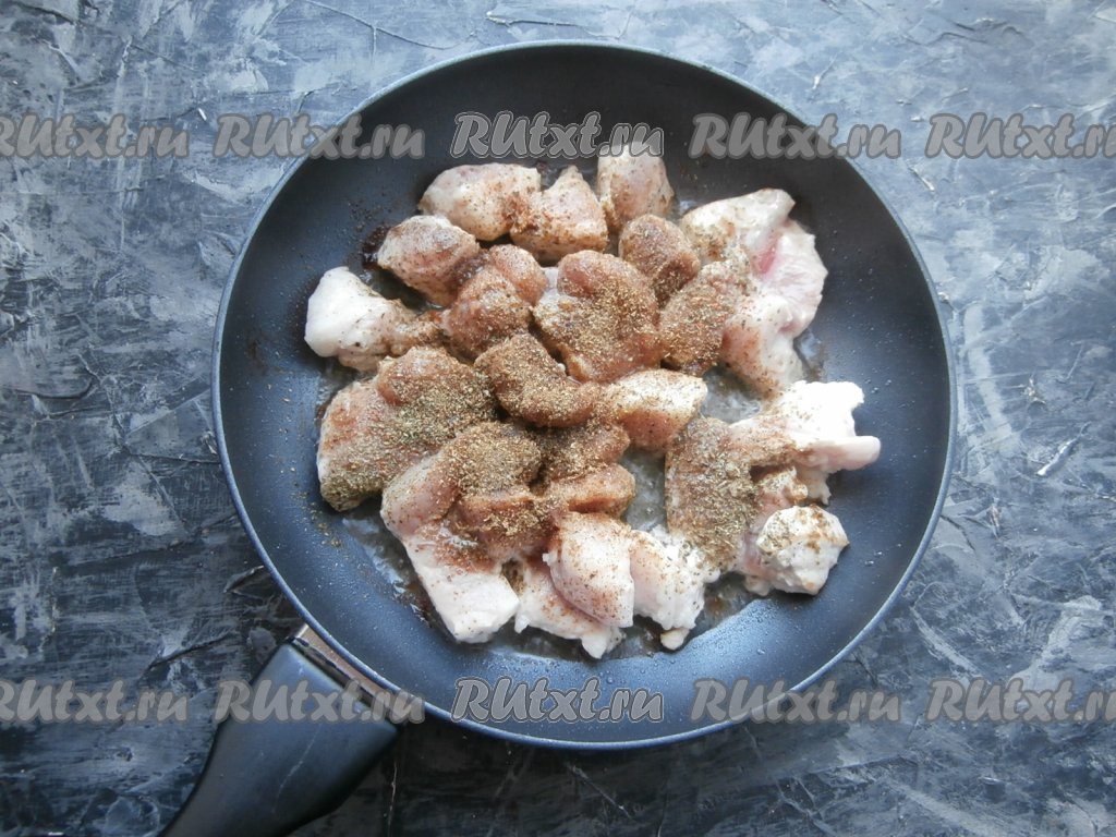 Кусочки мяса посыпать хмели-сунели, приправой, чёрным молотым перцем и кориандром.