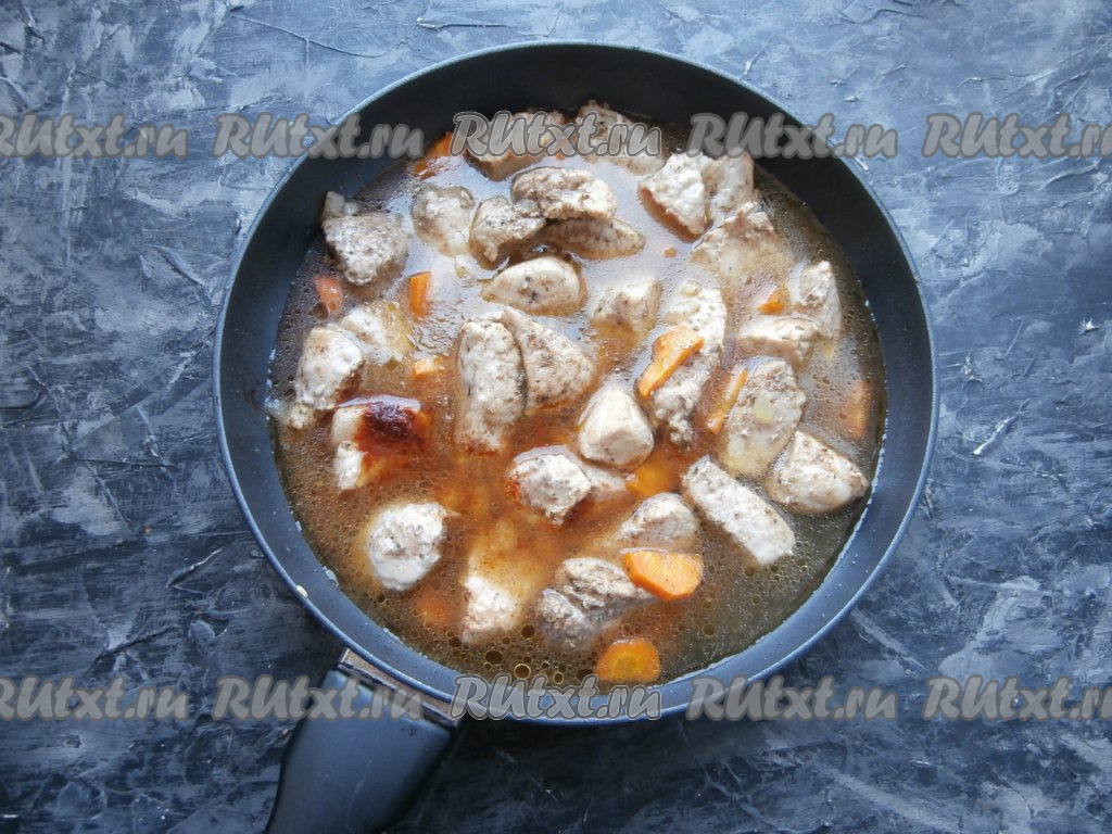 Всё перемешать и протушить блюдо с закрытой крышкой на слабом огне ещё 15-20 минут.