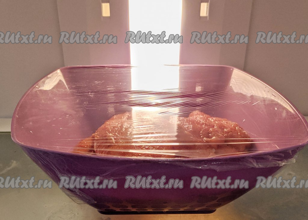 Затянуть ёмкость с куриным мясом пищевой плёнкой и убрать в холодильник, как минимум, на 30 минут.