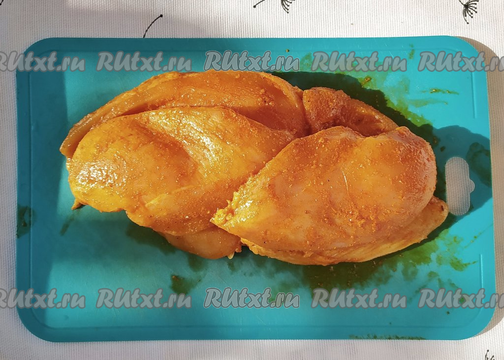 Поместить филе в глубокую ёмкость. Обвалять куриное филе со всех сторон в получившейся ароматной смеси, равномерно смазывая каждый кусочек мяса.