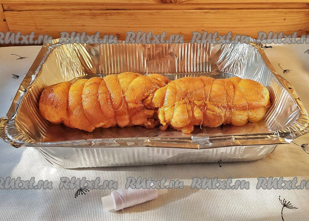Сформировать рулет, максимально сильно стянув кусочки филе обычной ниткой (у меня сороковка в одно сложение). Выложить получившийся куриный рулет в форму для запекания (или на противень, застеленный фольгой).