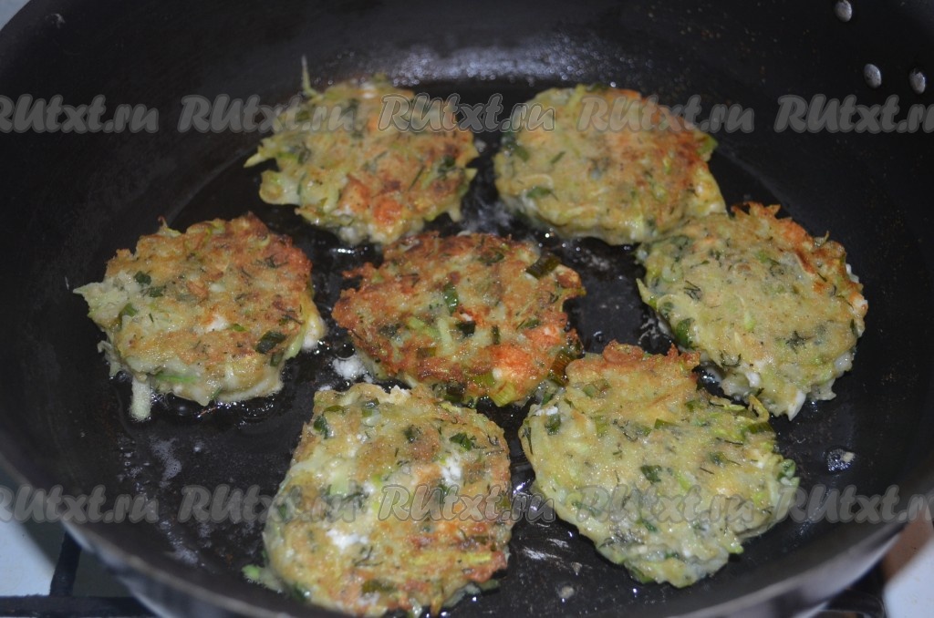 Жарить кабачковые оладьи с двух сторон до золотистого цвета на небольшом количестве растительного масла.