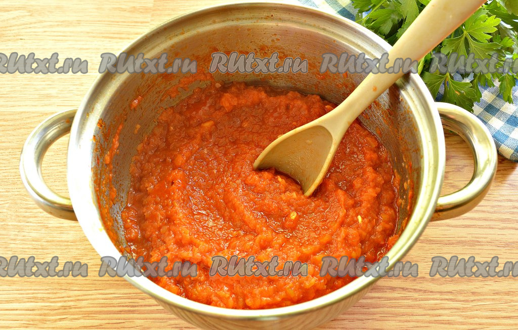 Кастрюлю с томатно-овощной смесью ставим на средний огонь. Когда аджика из кабачков с томатной пастой закипит, уменьшив огонь до минимального, варим 50 минут, периодически её перемешивая.