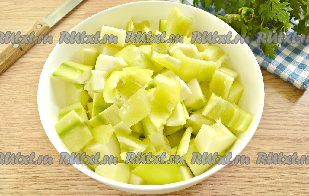 Для приготовления аджики по этому рецепту подойдут и молодые, и уже созревшие кабачки. Очищаем кабачки от кожуры, а если семечки достаточно крупные, их обязательно нужно удалить. Промываем сладкий болгарский перец, удаляем семенную коробочку с семенами. Подготовленный 1 килограмм кабачков и перец нарезаем на небольшие кусочки.