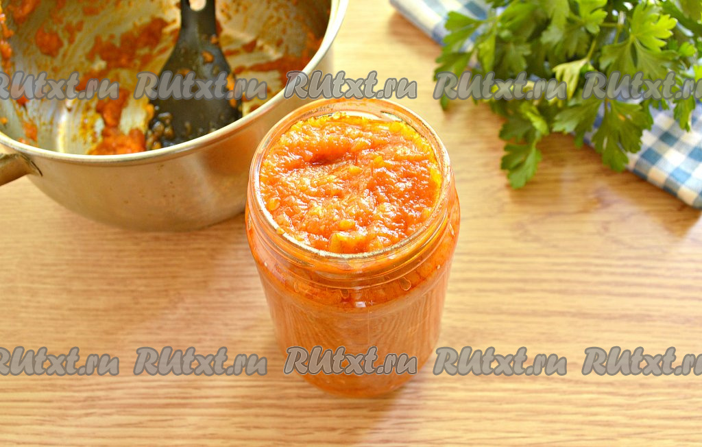 Горячую аджику из кабачков с томатной пастой раскладываем в простерилизованные банки (банки стерилизуйте, как вам удобно, я делаю это над паром), закручиваем прокипячёнными крышками.