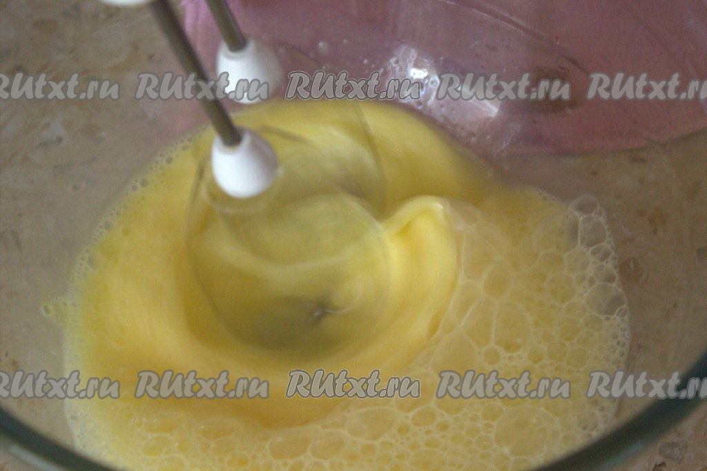 Духовку сразу поставить разогреваться до 220 градусов. В миску вбить яйца и на максимальной скорости взбить миксером в течение 3-4 минут.