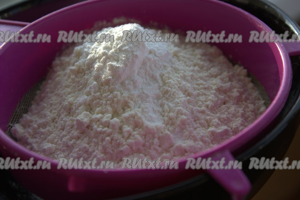 В отдельную ёмкость просеять через сито пшеничную муку с разрыхлителем.