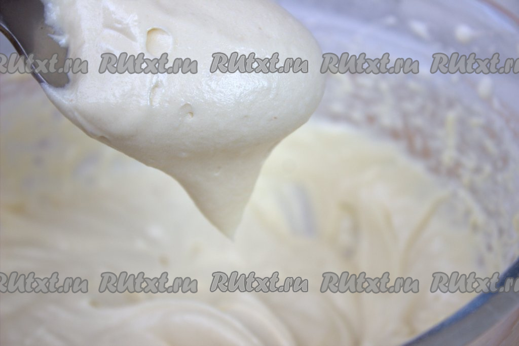 Небольшими порциями добавить просеянную с разрыхлителем муку в яично-масляную смесь, аккуратно перемешать ложкой. Тесто получится воздушным, похожим на густую сметану (как на фото).