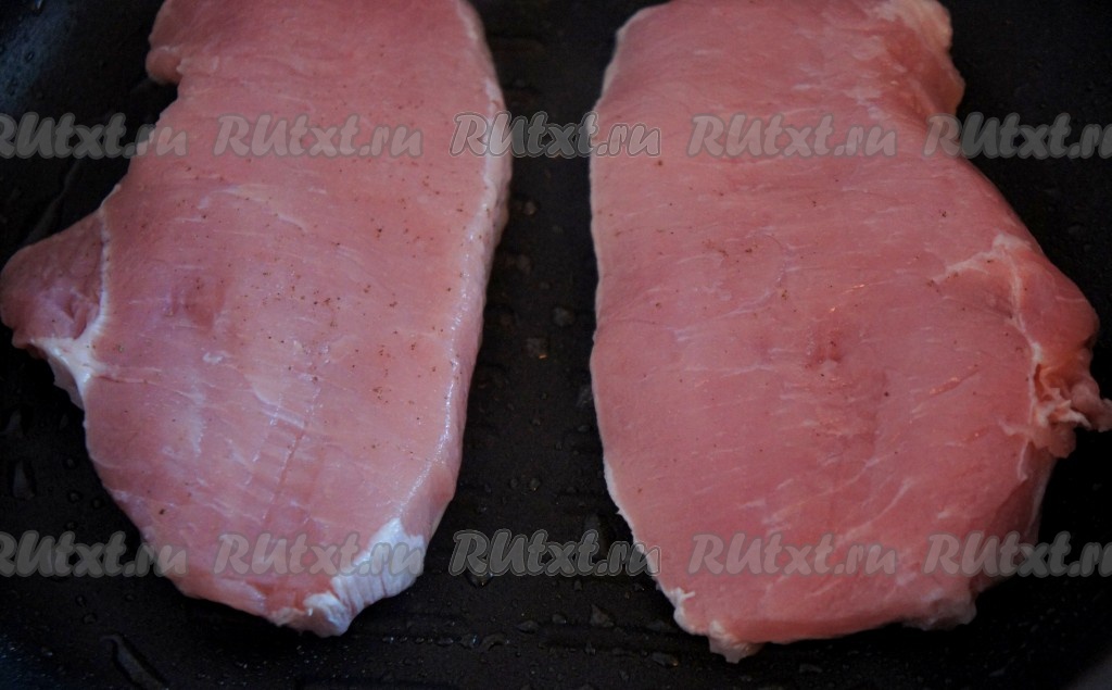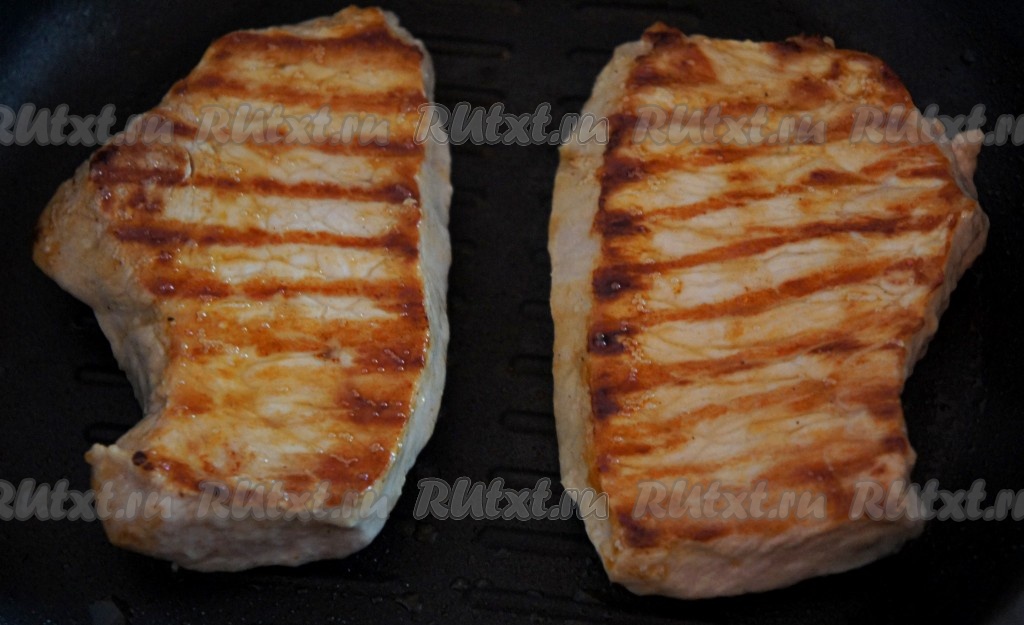 Гриль смазать небольшим количеством растительного масла (удобно использовать кондитерскую кисть) и хорошо прокалить. Выложить куски свинины и закрыть крышкой или фольгой, готовить 2-3 минуты с одной стороны.