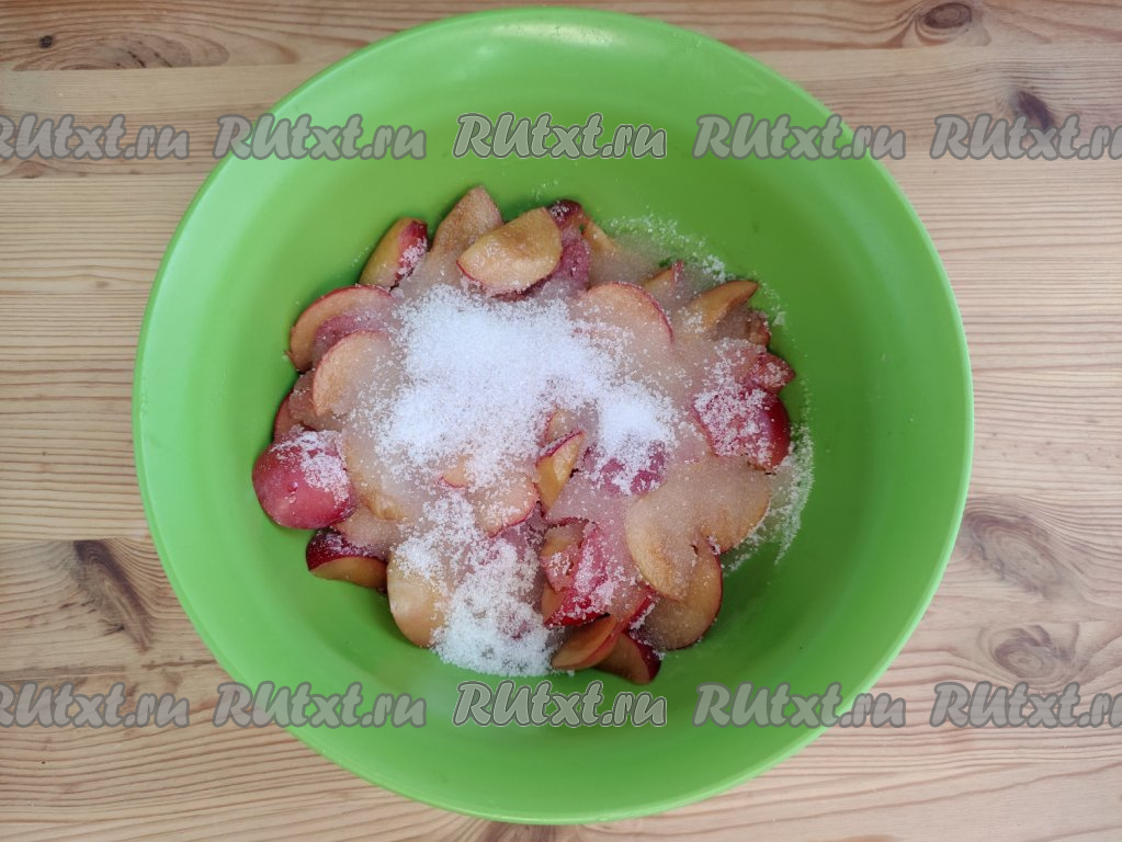 Промыть красную алычу, нарезать на небольшие дольки, удаляя косточки, и выложить в миску.