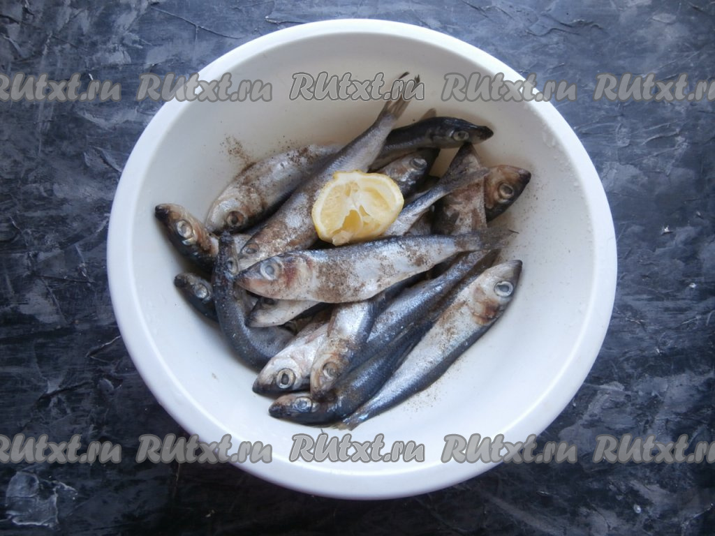 Салаку разморозить, помыть, посыпать солью и перцем, выдавить на рыбку лимонный сок и перемешать. Оставить рыбу на 30-40 минут.