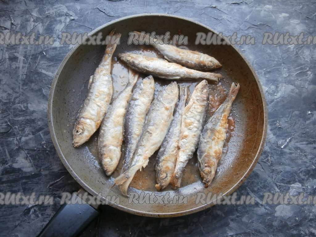 Жарить салаку в муке на среднем огне на сковороде до румяности с двух сторон.