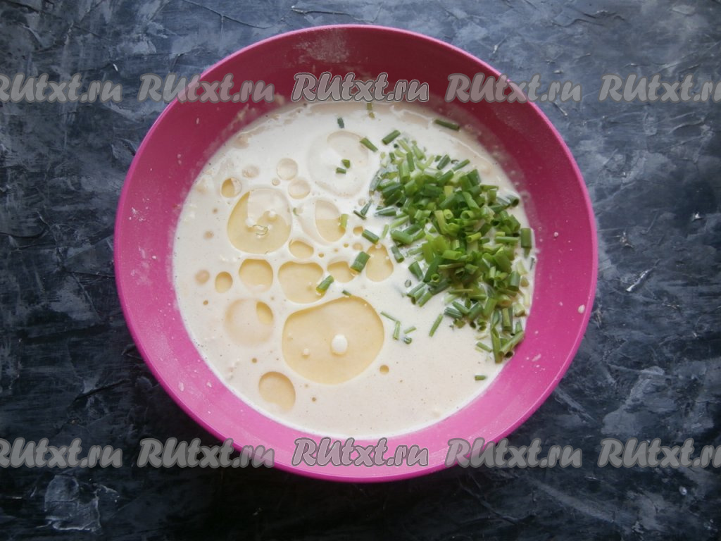 В получившееся картофельное тесто добавить измельчённый зелёный лук и сразу влить растительное масло, хорошенько перемешать. Тесто получится средней густоты.