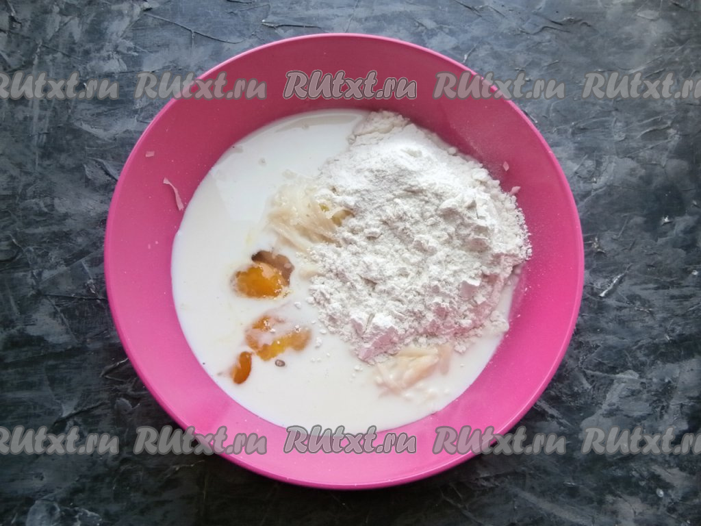 К натёртой картошке влить молоко, добавить яйца, соль, всыпать муку.