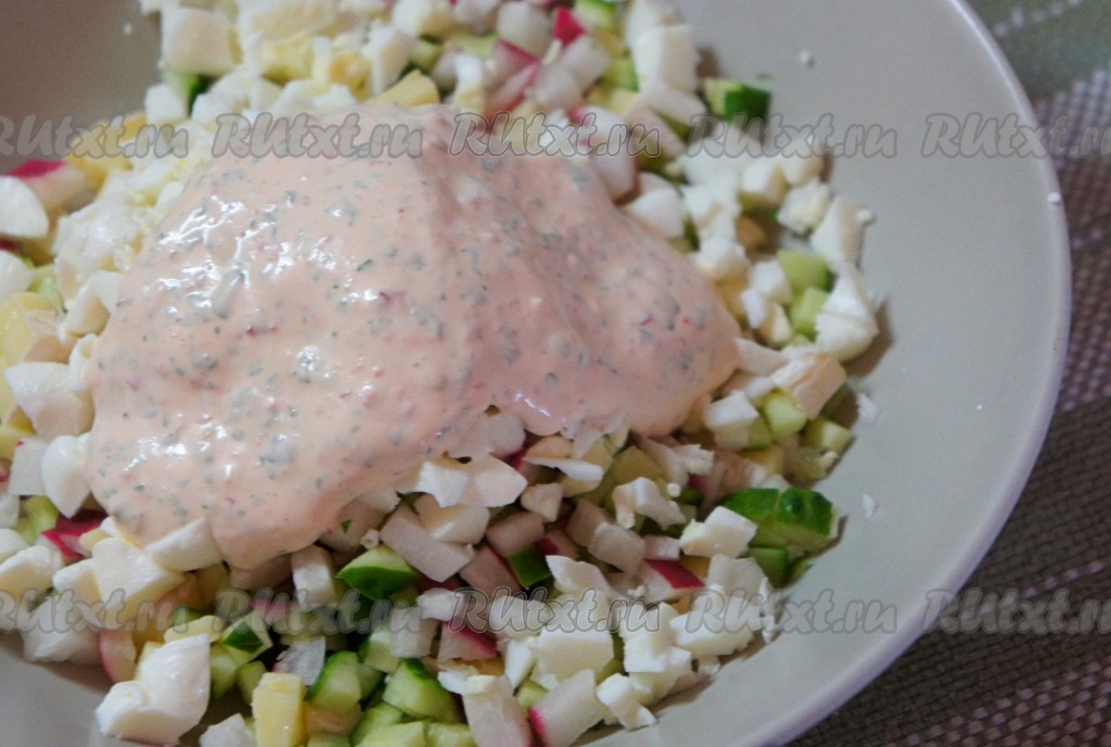 Редис нарезать мелкими кубиками.