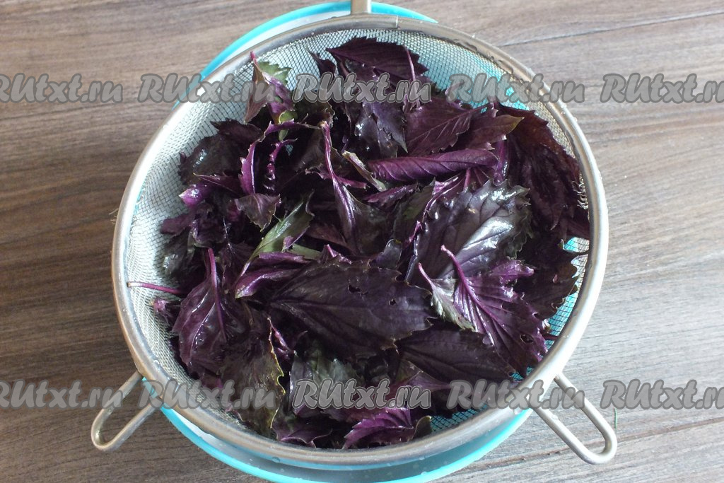 Прежде всего подготовьте 3-литровую банку и крышку. Банку вымойте с содой, а затем простерилизуйте любым удобным способом (я стерилизую над паром). Крышку прокипятите в воде в течение 3-5 минут, а затем держите её в кипятке до момента закручивания. Промойте базилик под проточной водой, отделите листики, стебельки нам больше не понадобятся. Листочки выложите в сито, чтобы стекла вода.