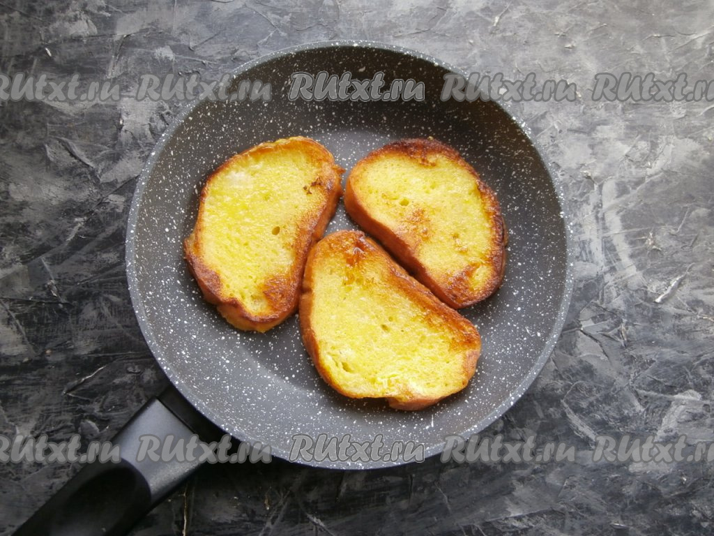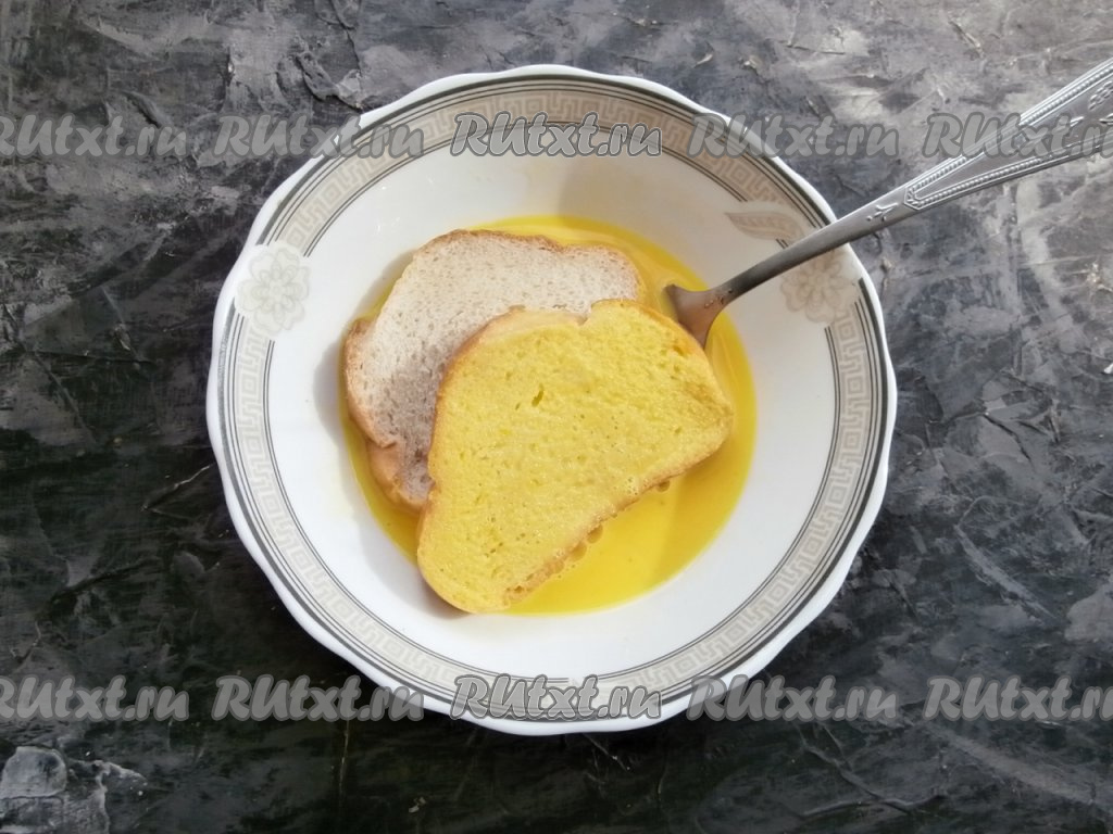 Окунуть ломти батона полностью в яично-молочную смесь.