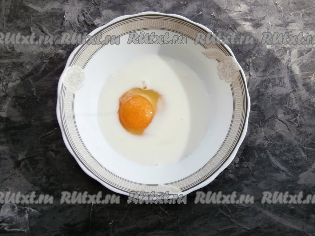 В миску (или в глубокую тарелку) влить молоко, добавить ванильный сахар и сырое яйцо.