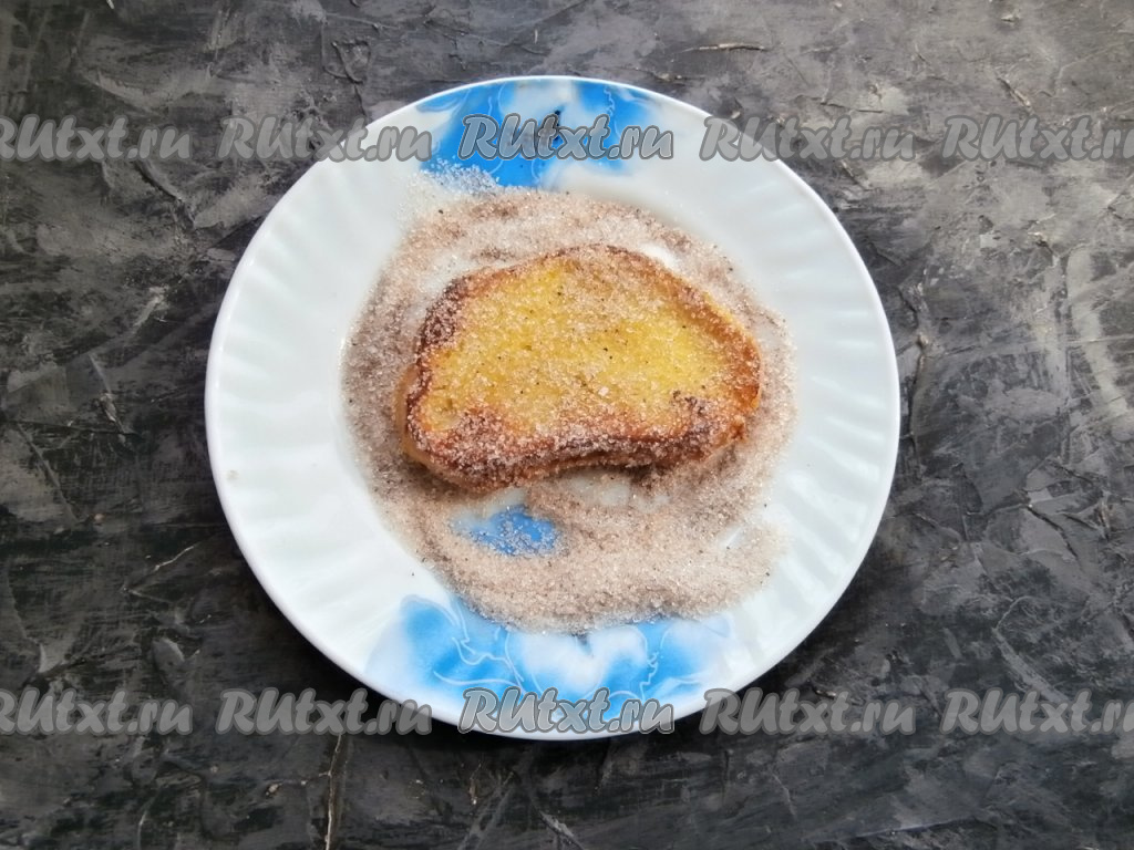 Горячие гренки обсыпать со всех сторон смесью сахара и корицы.