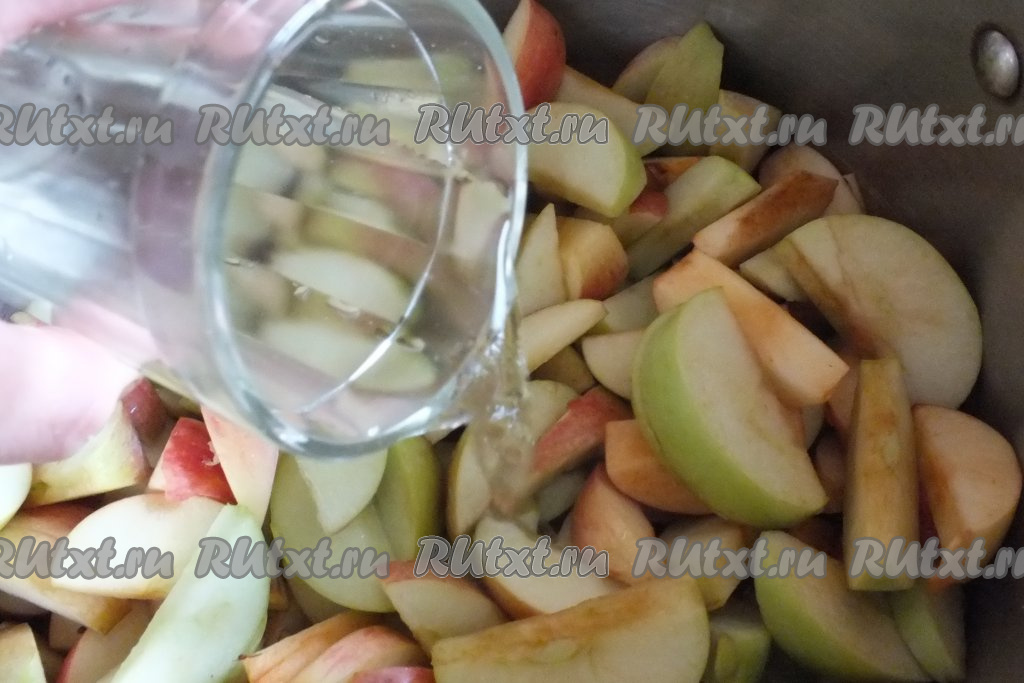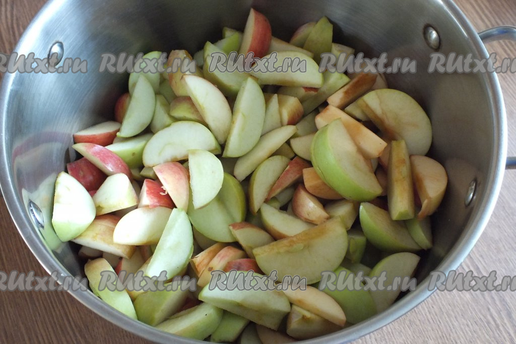 Яблоки вымыть, удалить семенную коробочку, если есть повреждения, то обрезать. Нарезать яблоки на дольки и только после этого взвесить. Я даю расчёт на 1 килограмм яблок, нарезанных дольками. Яблочные дольки выложить в достаточно объёмную кастрюлю с толстым дном.