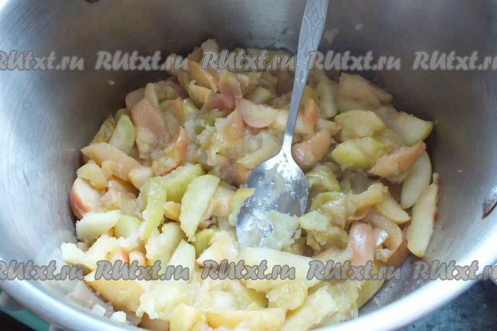 Поставить кастрюлю с дольками яблок и водой на средний огонь, прикрыть крышкой и с момента закипания уваривать в течение 15 минут (до мягкости яблок), иногда перемешивая. Если яблоки жестковатые, то может потребоваться чуть больше времени. Готовность долек можно определить, если провести по ним ложкой - яблоки должны легко разминаться. Снять кастрюлю с распаренными яблоками с огня и оставить до полного остывания (можно оставить на 6-8 часов).
