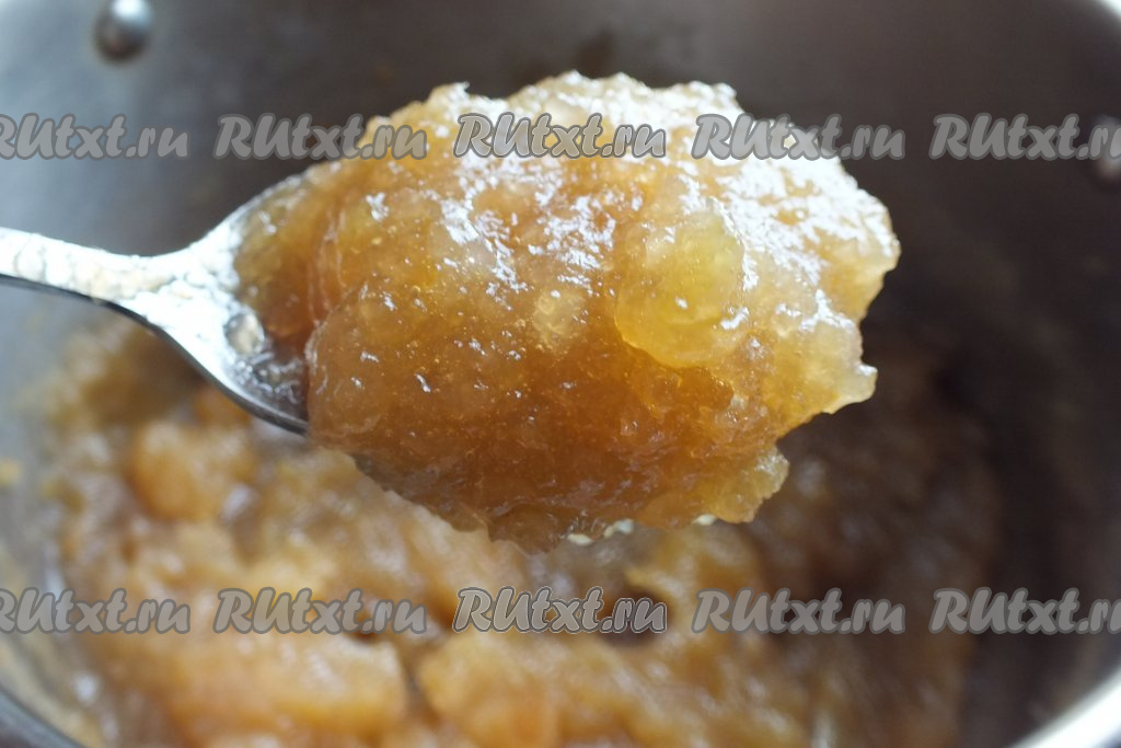 Когда яблочное повидло остынет, его нужно перемешать. Если оно держится на ложке и не стекает (как на фото), то варить его больше не нужно. Если же оно стекает, то необходимо поставить кастрюлю на огонь и проварить его на умеренном огне, помешивая, с момента закипания 20 минут, а затем, сняв с огня, снова охладить, а после этого проверить густоту. Но обычно для того чтобы яблочное повидло получилось густым, вполне достаточно двух варок.