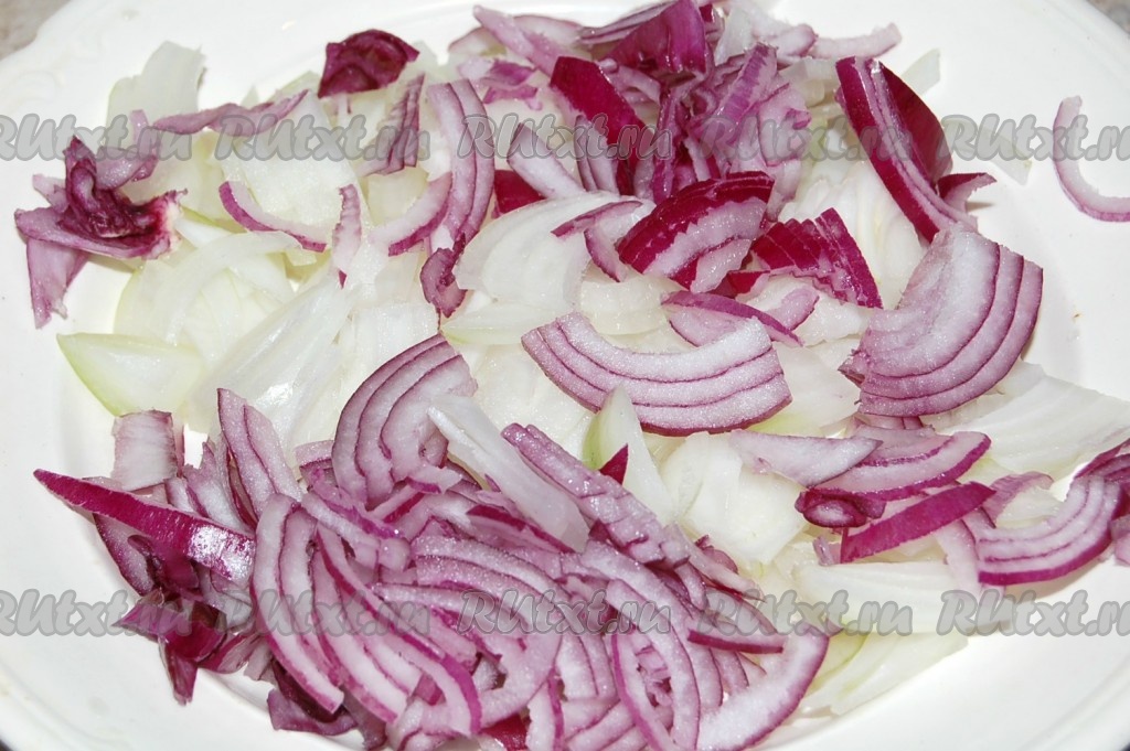 Нарезать репчатый лук обоих видов. Добавить лук к кабачкам в сковороду.