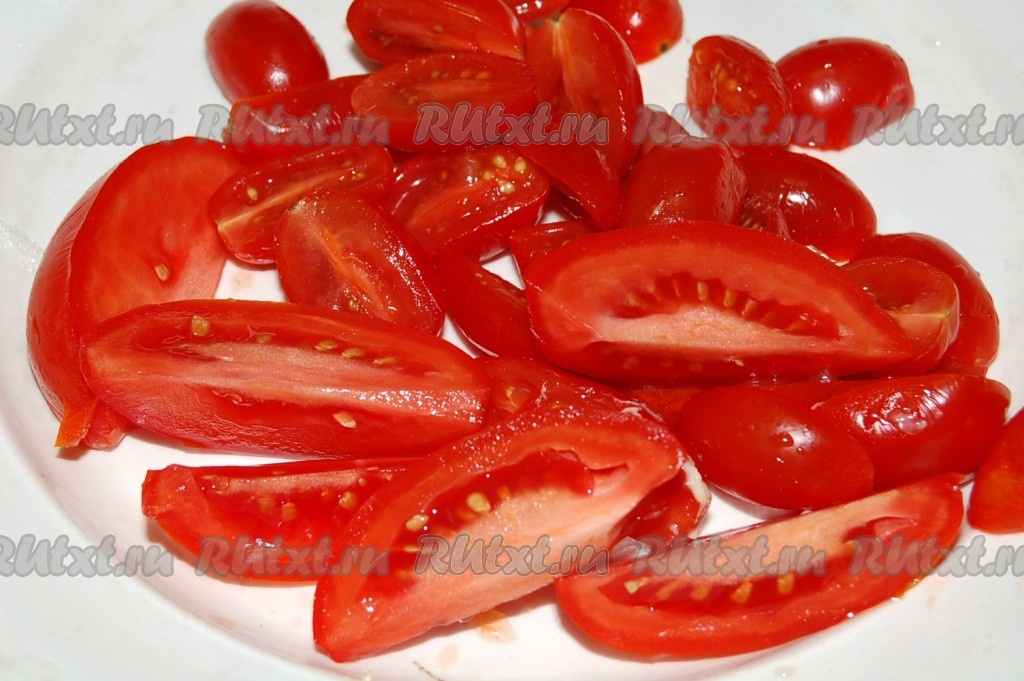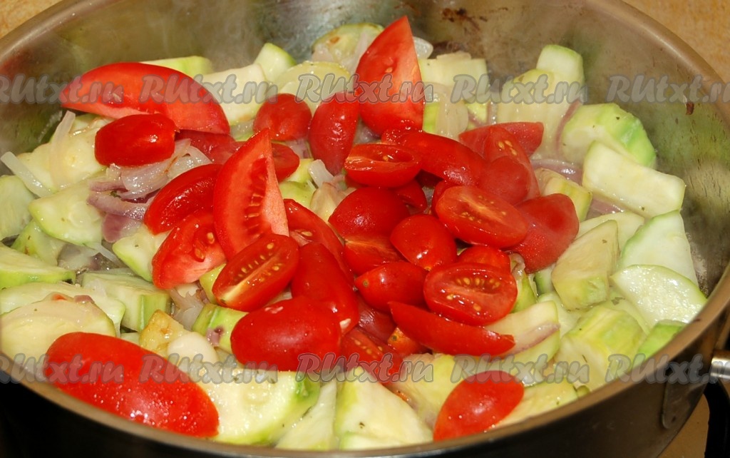 Помидоры нарезать крупно и тоже добавить к овощам в сковороду, жарить все вместе 5 минут.