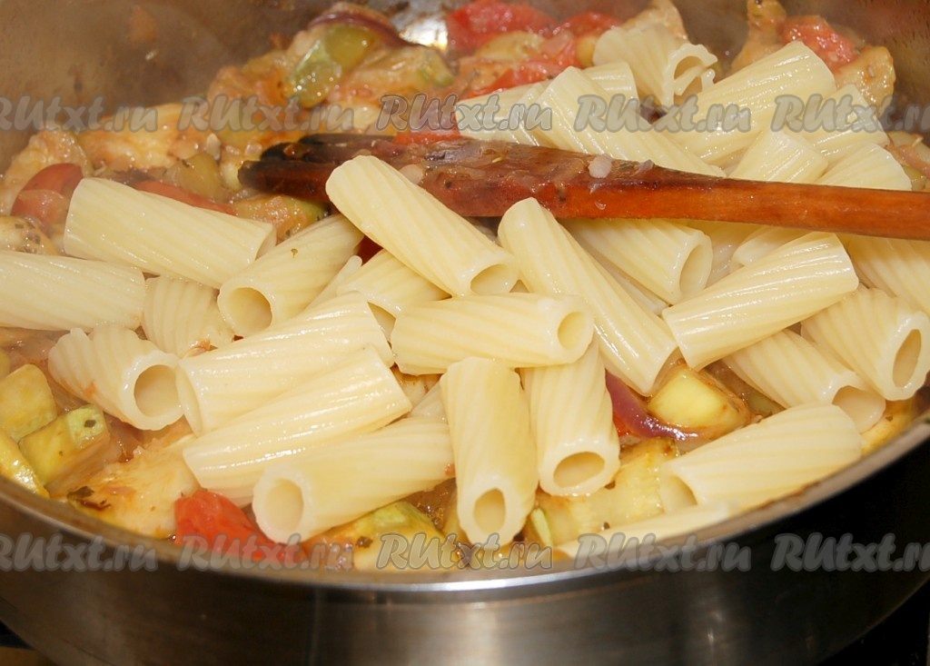 Отдельно отварить пасту, слить воду и прямо горячими добавить к кабачкам в сковороду. Вместе с пастой добавить натертый на крупной терке сыр.